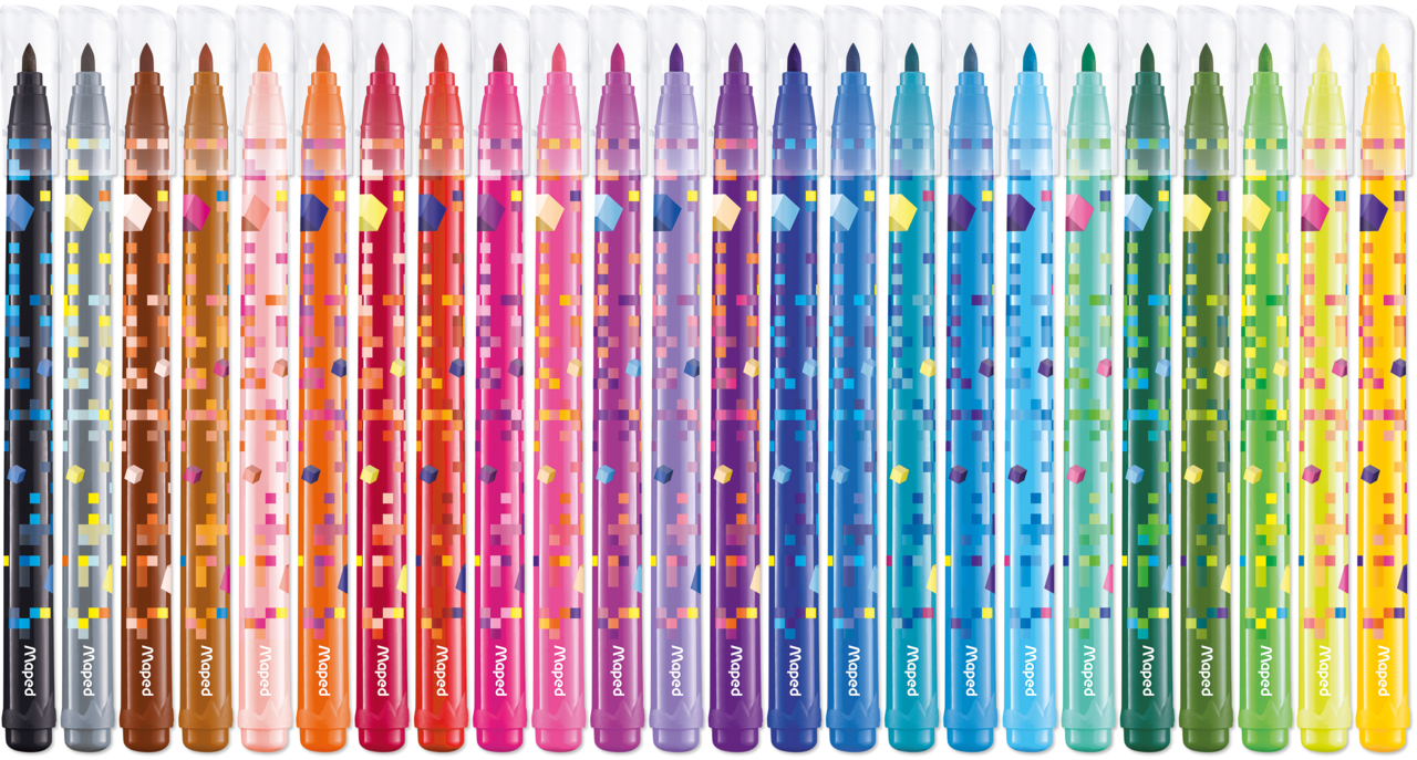 Bovendien kunnen ze tot wel een week zonder dop zonder uit te drogen. Pixel Party viltstiften voldoen aan de speelgoednorm voor veilig gebruik. Duik in een retro-futuristische setting geïnspireerd door spelcodes met de nieuwe Maped-collectie: Pixel Party! Deze kartonnen doos met 24 gepixelde viltstiften zal zowel meisjes als jongens aanspreken. Dankzij de medium punt en uitwasbare inkt zijn ze een geweldige bondgenoot voor dagelijks gebruik! Met zijn felgekleurde stiften en originele decoratie zullen je klasgenoten wanhopig hetzelfde willen hebben!