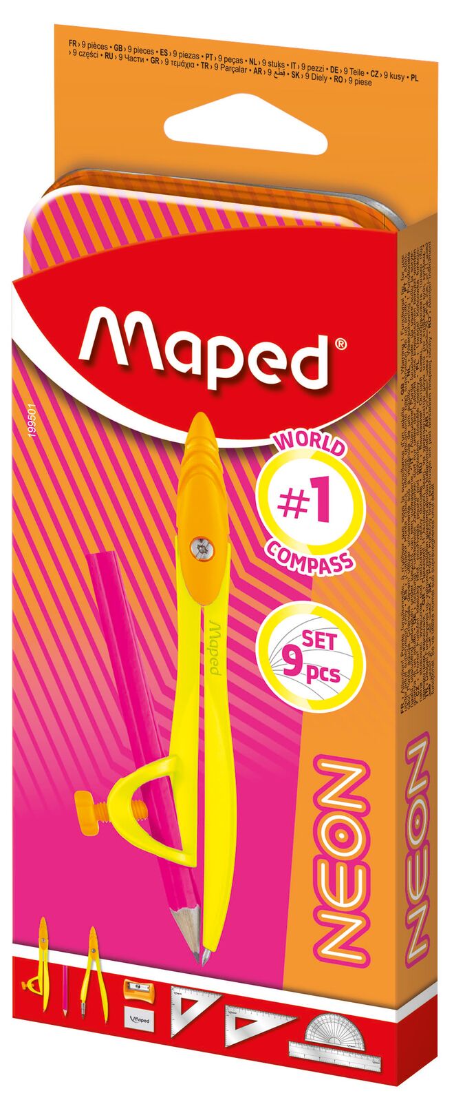 Uitgerust met metalen benen is de NEON passer perfect stijf en extreem duurzaam. Het is bestand tegen alledaags gebruik en het hectische leven van studenten. Het schroefsysteem maakt het mogelijk om potloden met een fijne tot medium diameter vast te houden om perfecte cirkels te tekenen. Ideaal voor verschillende stijlen en kleuren, voor levendige en kleurrijke ontwerpen. De passerset bevat 2 passers, een mini-tekenset, een potloodslijper, een gum en een potlood. Alles wordt opgeborgen in de beschermende metalen box , gemakkelijk te vervoeren.