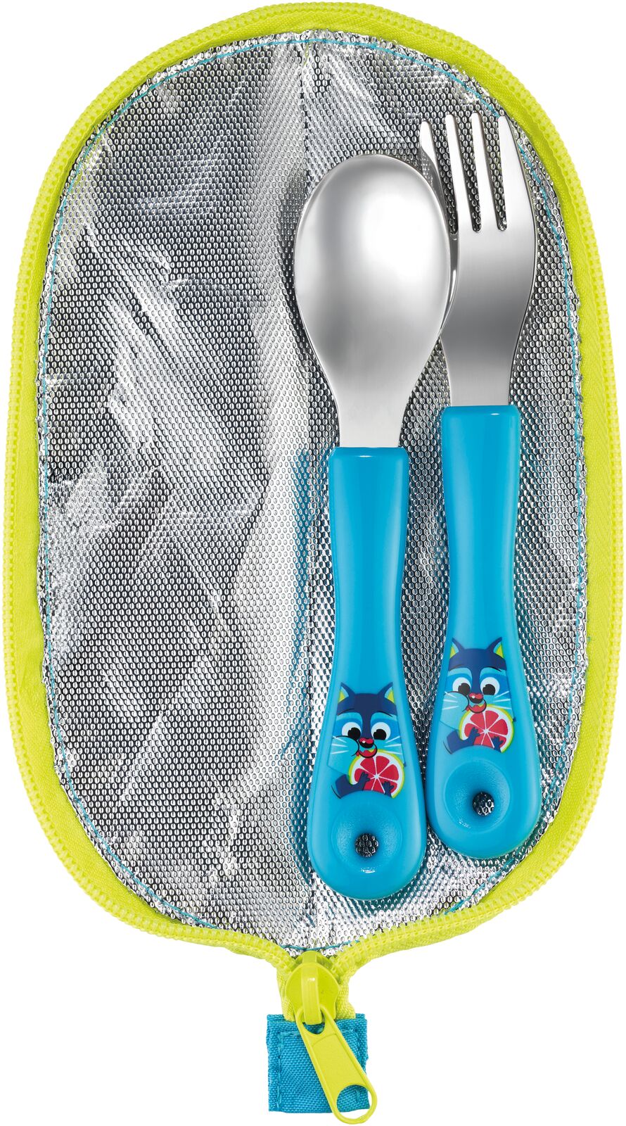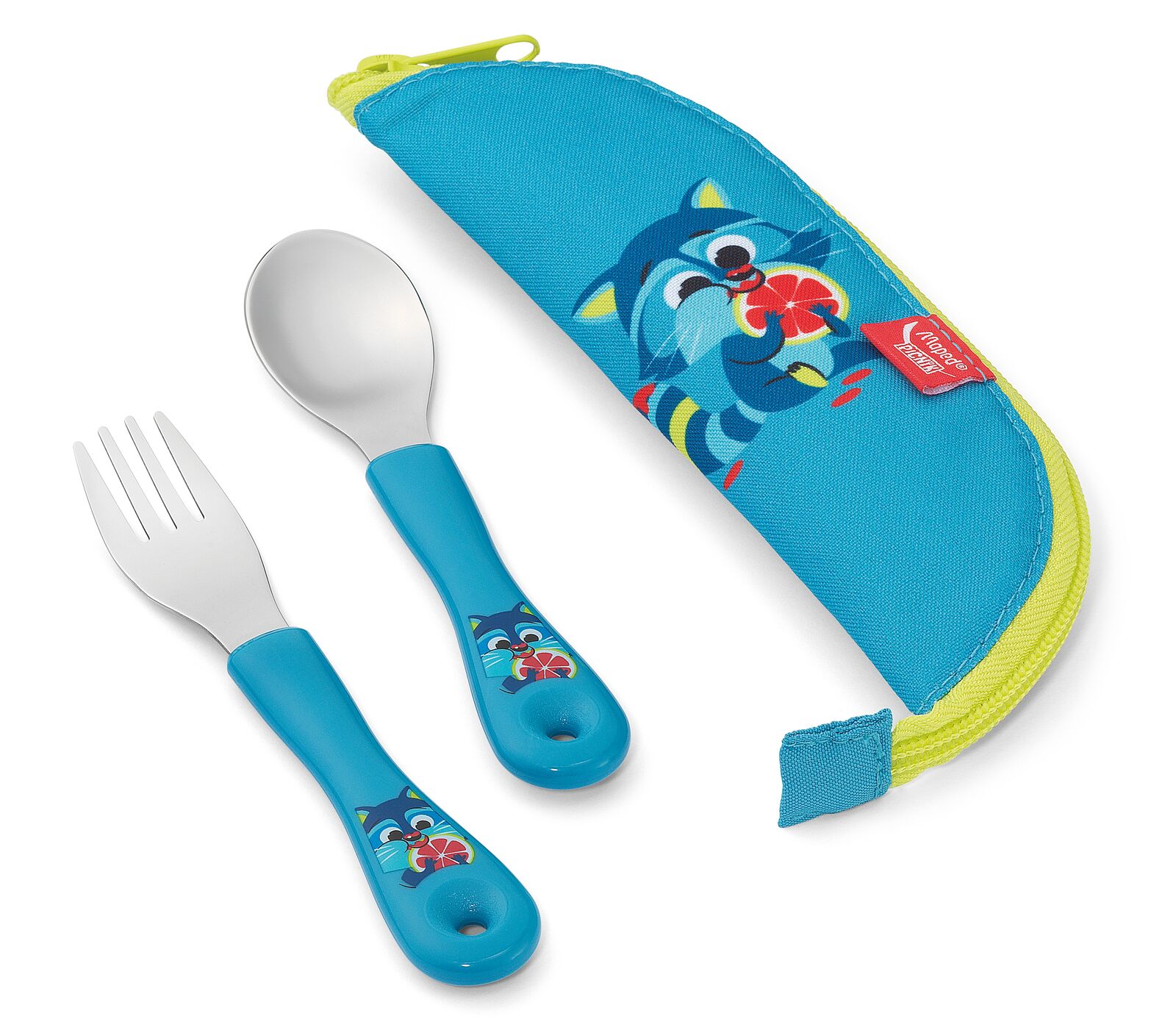 ERGONOMISCHE VORM OM GEMAKKELIJK TE KUNNEN ETEN! – Lepel + vork – Ergonomische vorm: ideale grip dankzij de pindavorm – Stoffen etui met gemakkelijk te openen en te sluiten rits – Bestek: roestvrijstalen uiteinden en ABS-handgrepen – Vaatwasserbestendig bestek – Binnenkant van het etui gemakkelijk afwasbaar met een spons