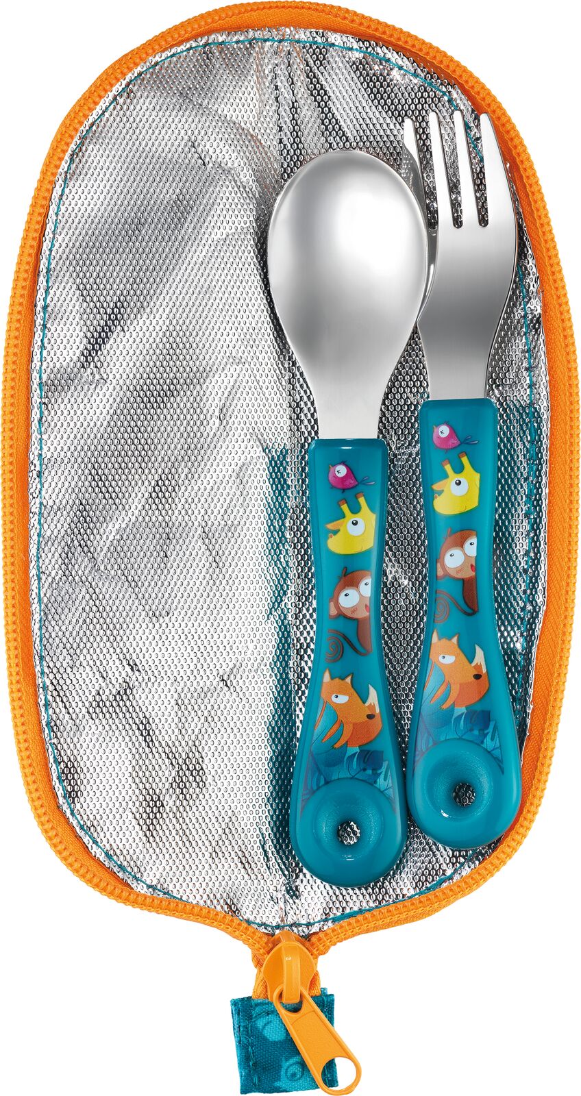 ERGONOMISCHE VORM OM GEMAKKELIJK TE KUNNEN ETEN! – Lepel + vork – Ergonomische vorm: ideale grip dankzij de pindavorm – Stoffen etui met gemakkelijk te openen en te sluiten rits – Bestek: roestvrijstalen uiteinden en ABS-handgrepen – Vaatwasserbestendig bestek – Binnenkant van het etui gemakkelijk afwasbaar met een spons