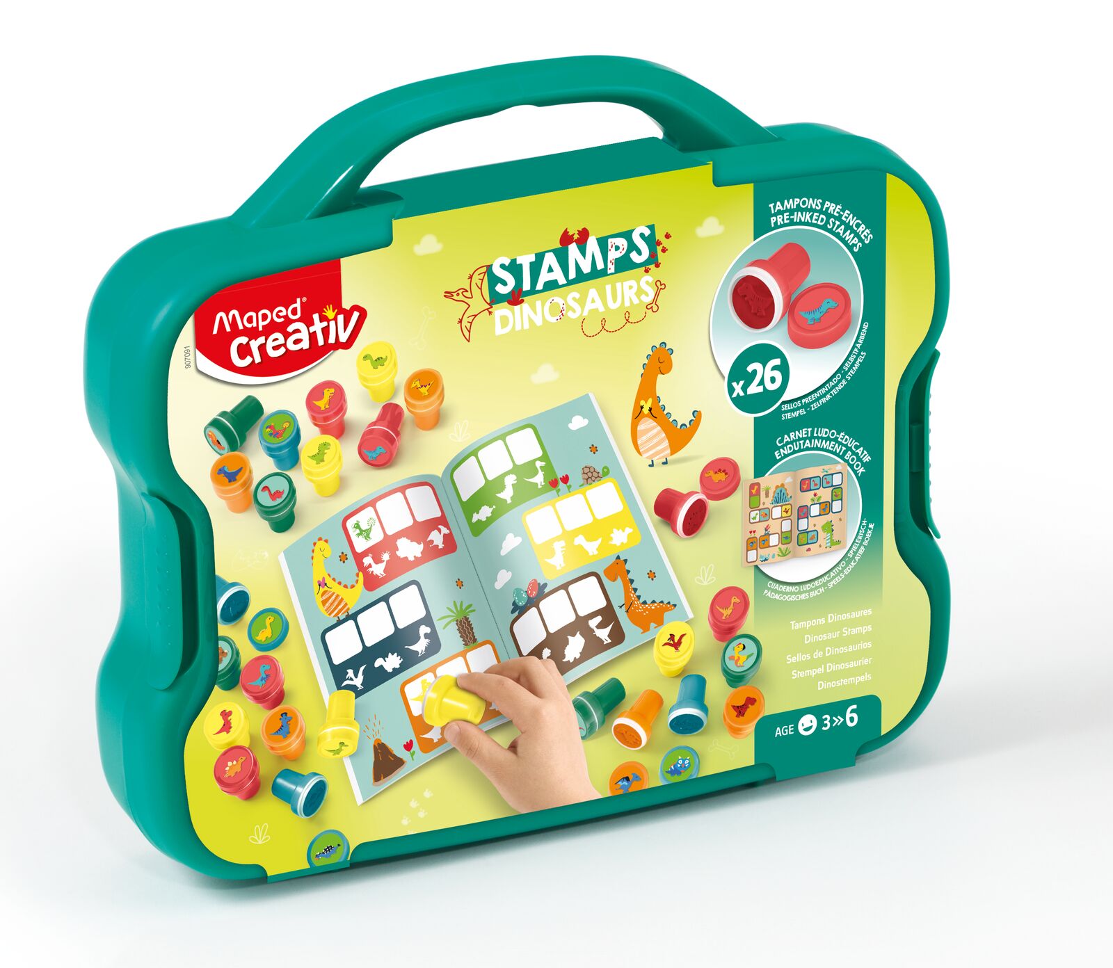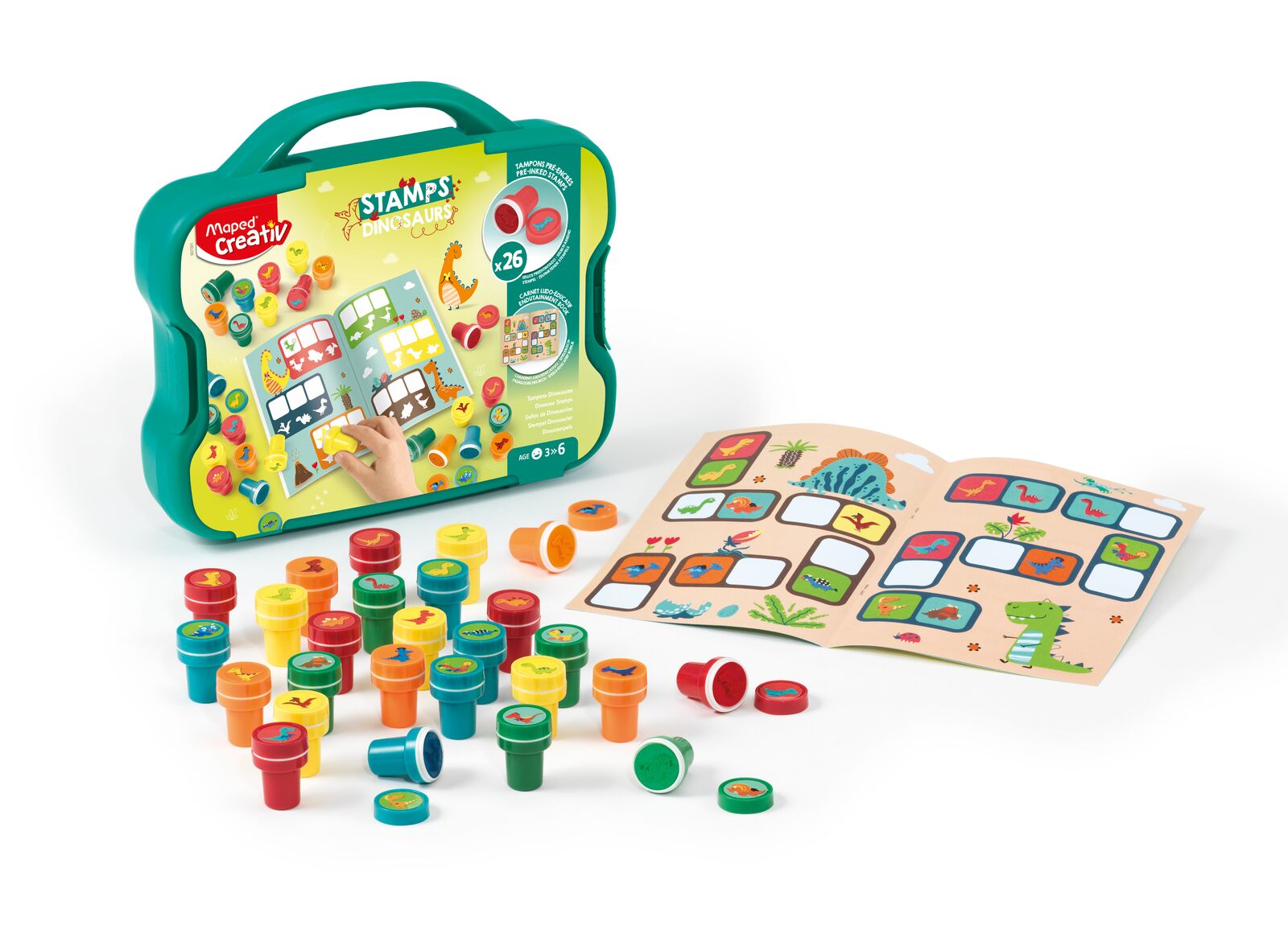 26 zelfinktende stempels in verschillende kleuren met als thema dinosaurussen, grappig en educatief. Eenvoudig mee te nemen en te gebruiken. Zelfinktende stempels met uitwasbare inkt. Een flinke keuze aan stempels en kleuren om je tekening te versieren of voor andere creativiteit. De set bevat 26 verschillende zelfinktende stempels en 1 grappig en educatief boekje. Het kunststof koffertje is herbruikbaar.