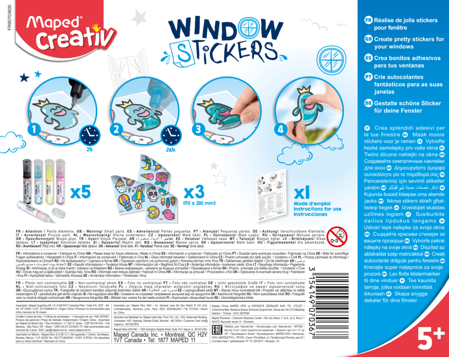 Maak je eigen grappige stickers om je ramen mee te versieren! Trendy kleuren voor plezier en unieke creaties. Gelamineerde activiteitenbladen. Gebruiksvriendelijke tubes met een fijne en precieze punt. De lijm is te gebruiken op verschillende ondergronden: glas, mozaïek, aarde werk. De set bevat 5 tubes verf en 3 activiteitenbladen dubbelzijdig (30 motieven).